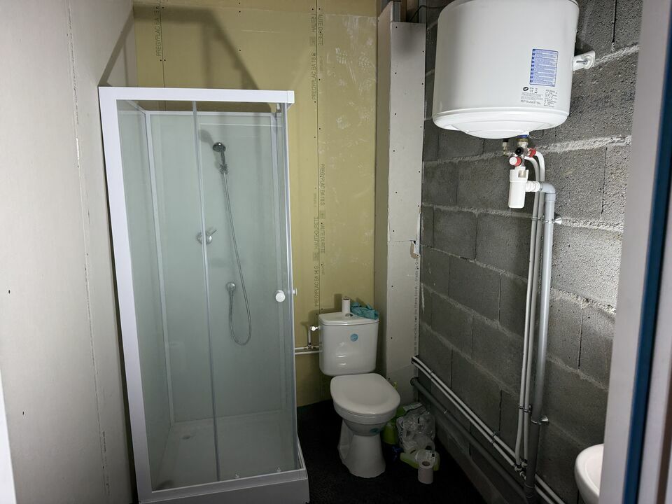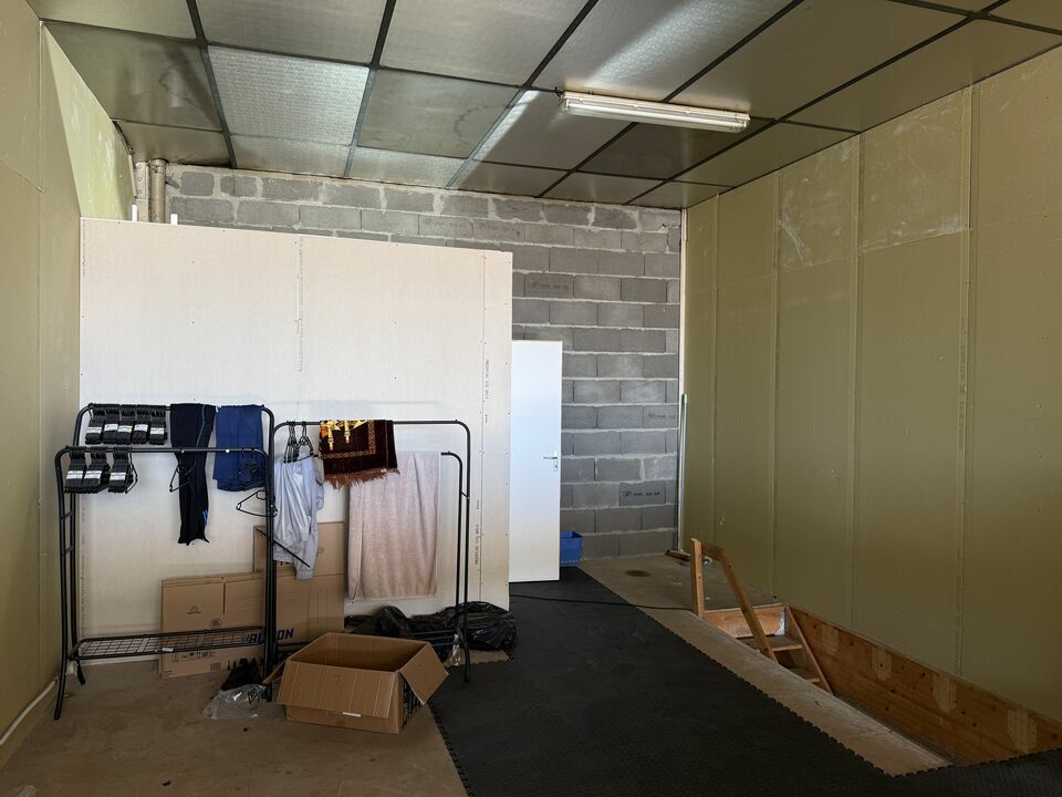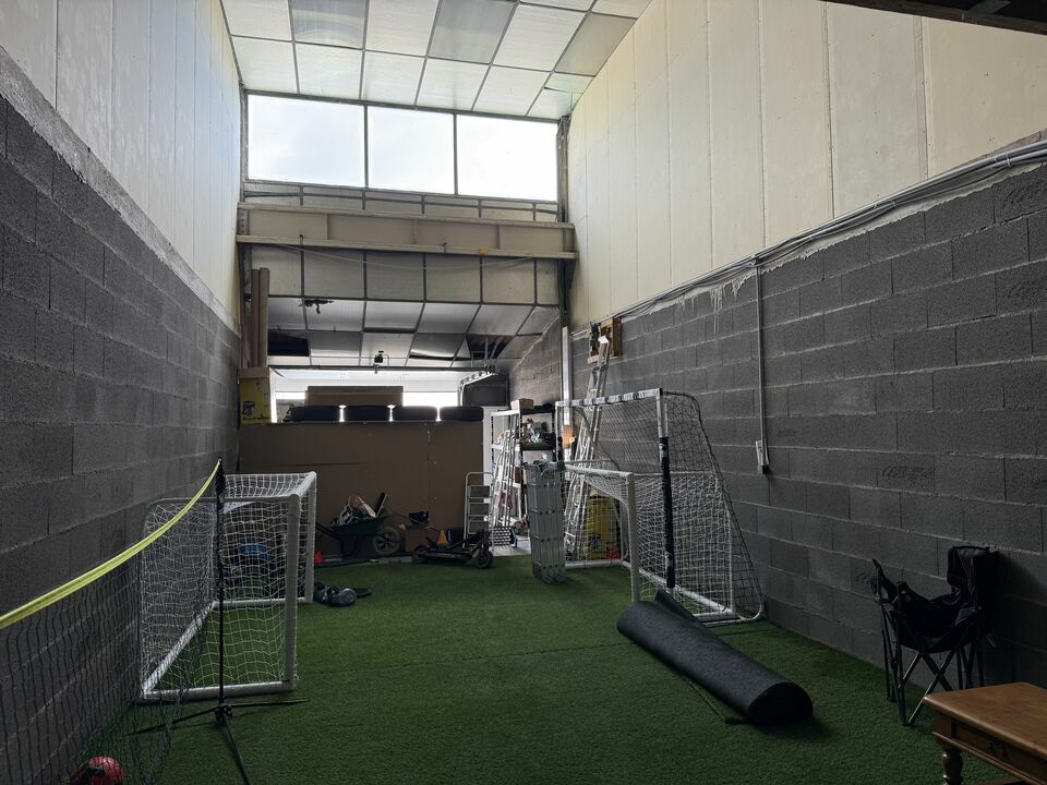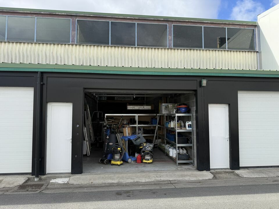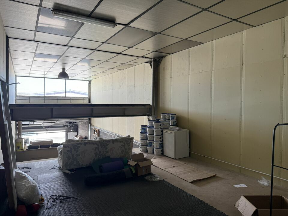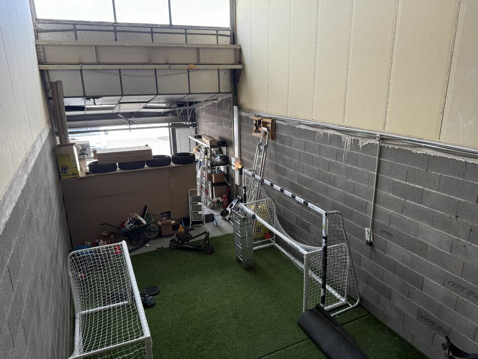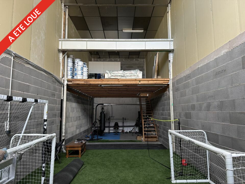 Accessible de plain-pied grâce à une porte sectionnelle électrique de 2,50 m de hauteur, ce local comprend 100 m² au sol et une mezzanine de 35 m² équipée d’un WC et d’une douche.
